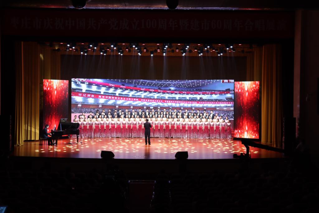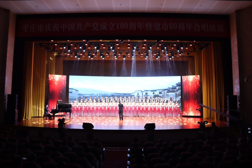 舞台上歌声醉人,舞台下掌声雷动。合唱团用嘹亮的歌声,传承红色基因,弘扬革命精神,唤起中华儿女的豪情壮志;用优美的旋律,讴歌党的光辉历程和伟大成就以及枣庄市建市60年以来经济社会发展取得的优异成绩,奏响民族复兴的宏伟篇章,以实际行动向中国共产党成立100周年献礼。