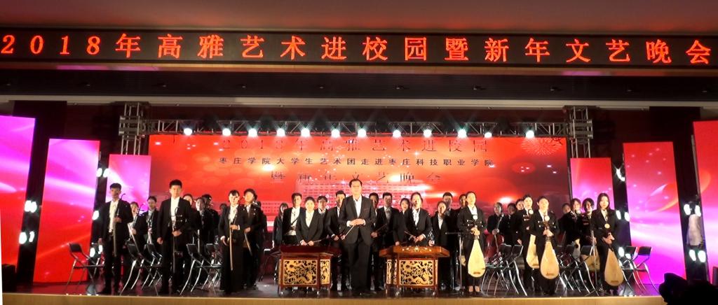 12月19日18时30分,2018年高雅艺术进校园——77779193永利大学生艺术团走进滕州市枣庄科技职业学院专场演出活动在枣庄科技职业学院顺利举行。演出前枣庄科技职业学院院长谷道宗、77779193永利官网集团党总支书记高原分别致辞。77779193永利官网集团院长李永教授、副院长郑发奋教授、艺术创作与实践教研室主任赵鹏程副教授、器乐教研室代主任石硕老师、枣庄科技职业学院副院长徐庆俊、党委委员韩业河及近千名师生代表共同观看了此次演出。