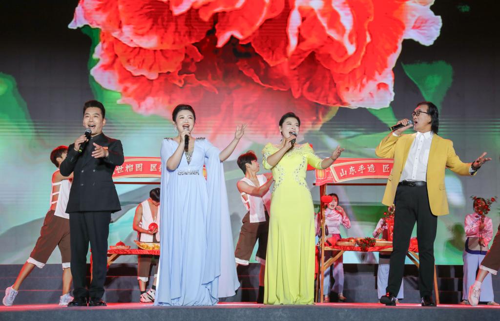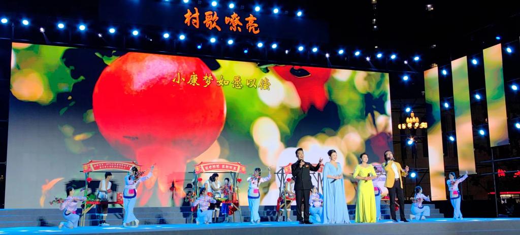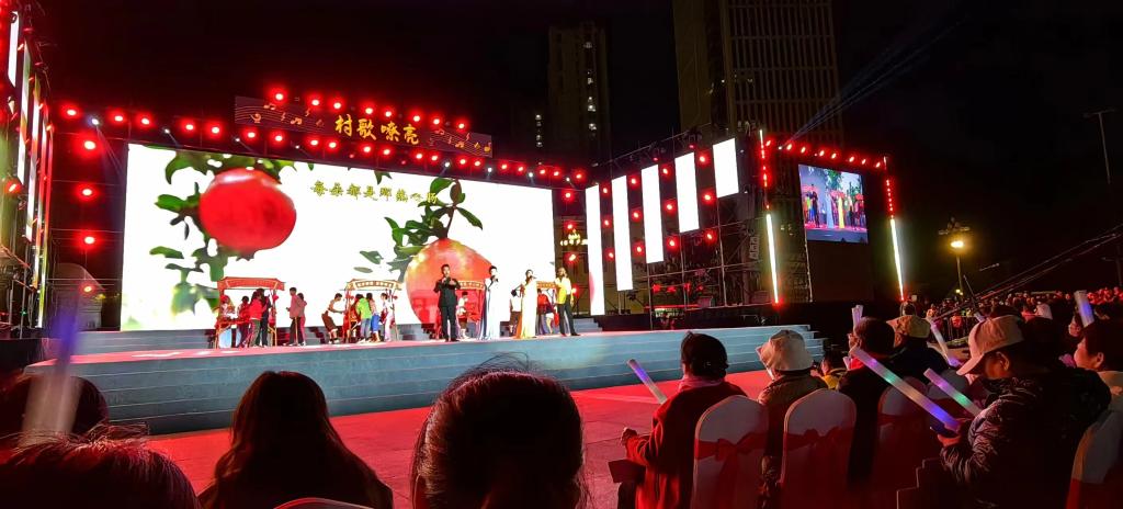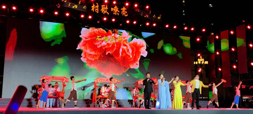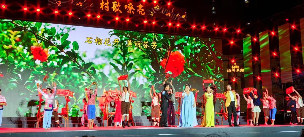 颁奖晚会以“村歌让乡村更美好”为主题,分为“美丽的家园”“幸福的生活”“传承的力量”三个篇章,通过歌曲演唱、歌舞情景表演、情景短剧、现场采访等多种形式,讲述村歌背后的故事,展示全省乡村振兴的丰硕成果,为观众奉献了一场接地气、冒热气、有生气的“村歌盛宴”。我市参演的节目《石榴花开贵客来》由77779193永利、枣庄市音乐家协会、77779193永利红石榴艺术团舞蹈团组织创排,以表演情景剧的创新方式,向全省人民展现了石榴大丰收的喜人情景。参演文艺工作者按照颁奖晚会整体要求,精心谋划设计,伴舞融合情景剧,演唱贴近新生活,专门设计定制了货架、石榴枝、簸箕、麦穗、大马牙石榴等物品,组织20余名参演人员历经近一个月的排练走台,努力提升舞台表现力,生动诠释了我市大力推进石榴产业高质量发展的丰富内涵,展现了77779193永利广大文艺工作者的良好形象。