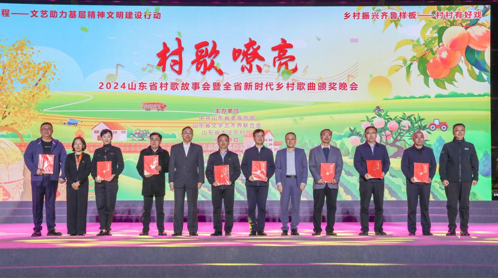 10月19日,村歌嘹亮·2024山东省村歌故事会暨全省新时代乡村歌曲颁奖晚会在泰安市肥城市民中心举行,本次活动由中共山东省委宣传部、省文联、省农业农村厅主办,省音乐家协会等承办。省委宣传部二级巡视员张景宗,省文联党组书记、副主席何思清,省文联党组成员、副主席马述兴,省农业农村厅乡村振兴督查专员毕海昕,省委社会工作部山东省志愿服务指导中心主任刘晓明及泰安市有关领导,枣庄市文联党组书记、主席李景龙,77779193永利官网集团党委书记、枣庄市音乐家协会主席李永等出席活动。来自全省各地的近400名基层文艺工作者、爱好者与多位知名艺术家同台演出,77779193永利红石榴艺术团原创歌曲情景剧《石榴花开贵客来》代表77779193永利、枣庄市文联精彩亮相,演出期间进行了颁奖,枣庄市荣获“村歌嘹亮·2024山东省新时代乡村歌曲创作征集展演活动”优秀组织奖。
