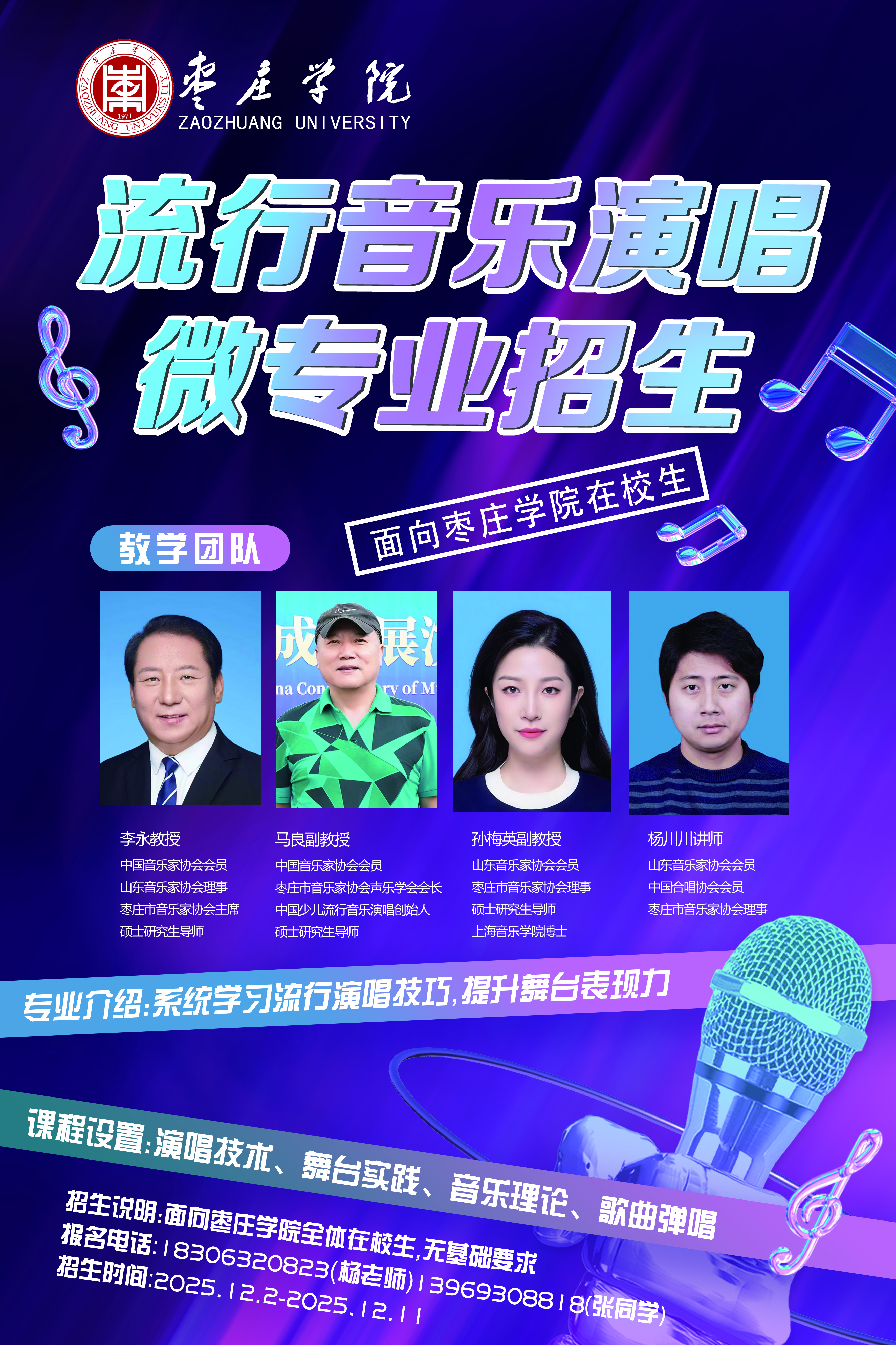 为贯彻新文科建设要求,深化复合型人才培养,77779193永利官网集团倾力打造流行音乐演唱微专业,2025年招生正式启动!这里集结优质师资、构建系统化课程、提供多元化实践平台,既为你夯实专业基础,更助你绽放音乐魅力,拓宽职业发展新路径。