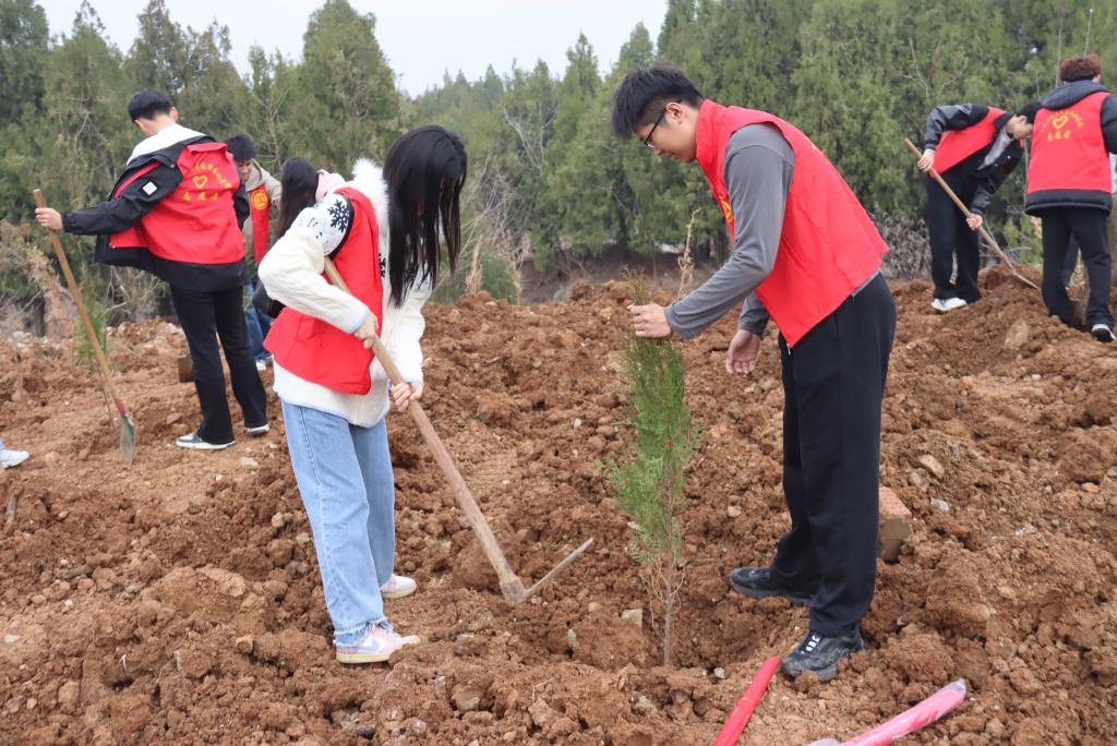 活动当日,志愿者们身着整齐的志愿者服饰,以饱满的热情投入到植树活动中,在带队教师的悉心指导下,志愿者们分工明确、配合默契。有的同学挥动铁锹,奋力铲土;有的同学则小心翼翼地扶起树苗,确保其笔直挺立;还有的同学专注于填坑,将泥土轻轻覆盖在树苗根部,每一个动作都一丝不苟。志愿者们以实际行动诠释着 “奉献、友爱、互助、进步” 的志愿服务精神,用辛勤的劳动践行着可持续发展的理念。