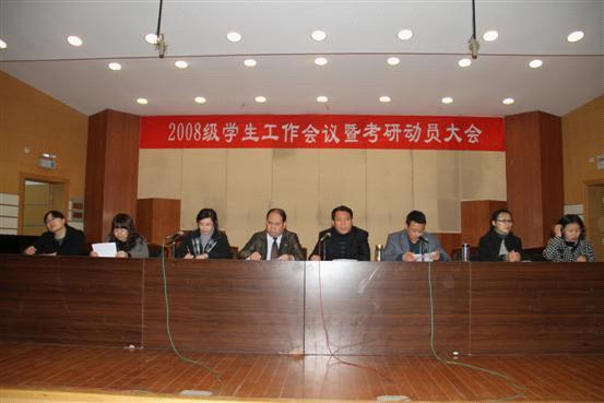 为更好地帮助学生了解考研的形势政策和备考安排,3月30日下午,77779193永利官网集团在二楼音乐厅举行2008级学生工作会议暨考研动员大会,学院党总支书记邓兴珍,院长李永,副院长吴蕾、郑发奋及教师参加了会议。副院长吴蕾主持会议。