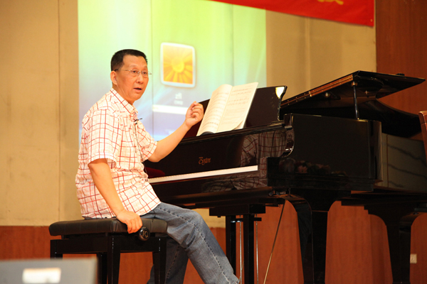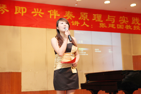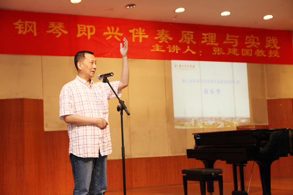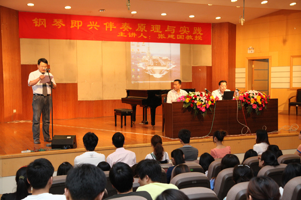 讲座分两场进行,首先由张建国教授做了题为《钢琴即兴伴奏原理与实践》的讲座,钢琴即兴伴奏,是一门理论性与实践性并重的综合性音乐课程,是高师音乐教育专业学生必备的一项专业基本功,张教授在讲授过程中,提出即兴伴奏设计中的“三步走”习程路径,即:选配和弦、设计织体和处理细节。要求弹奏者要必须从艺术的角度,通过各种实用而新颖的研究方法,从歌曲的分析、和声的应用、音型织体的采用、情绪的深化、钢琴的弹奏与演唱的和谐统一上进行探索,将钢琴演奏技术、和声配置、曲式分析、听觉辨析、复调和旋律创作、声乐演唱等方面的知识及技能进行综合运用。讲座中,张建国教授通过对几首为师生喜闻乐见的歌曲,如《长江之歌》、《亚洲雄风》、《小草》等歌曲编配,让我们对钢琴伴奏的和声、音型织体、表现力等方面进行了具体而生动的示范演奏。并与在场学生进行了解疑答惑互动,使同学们在钢琴即兴伴奏方面获益良多。