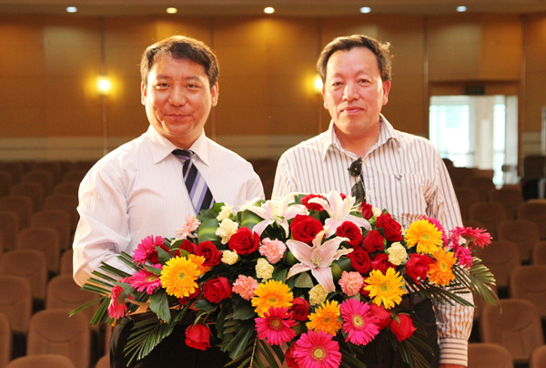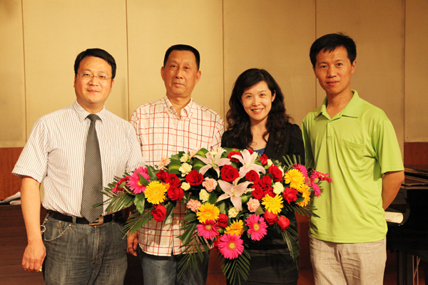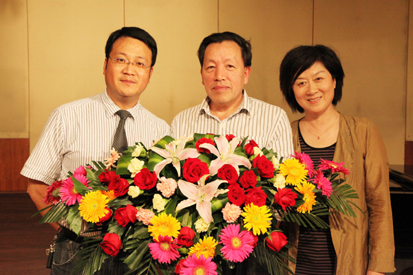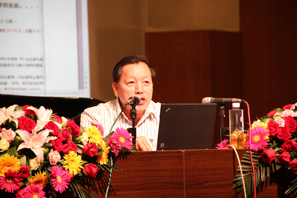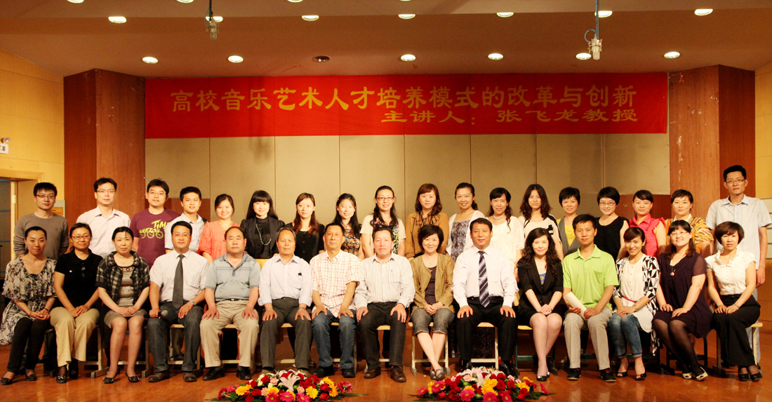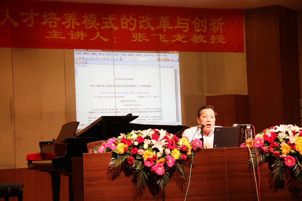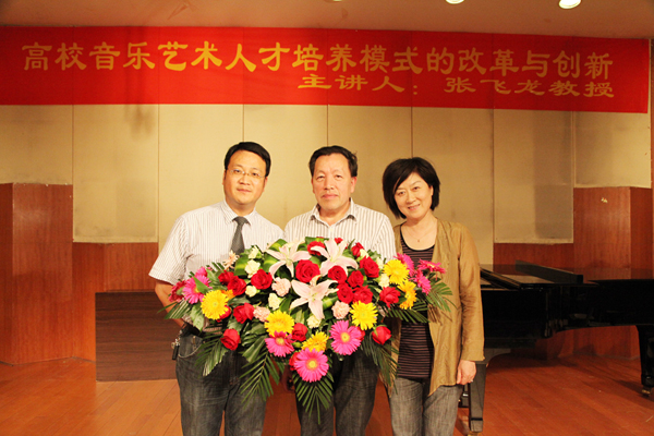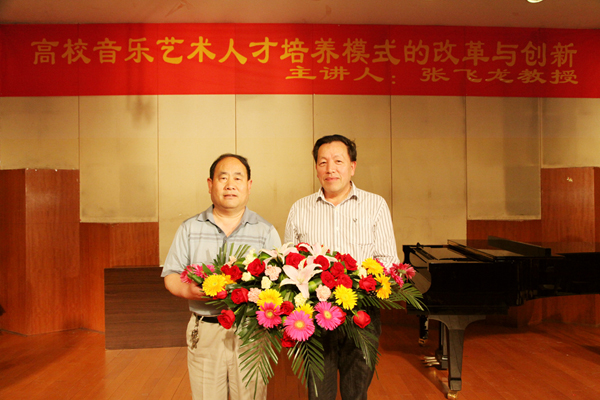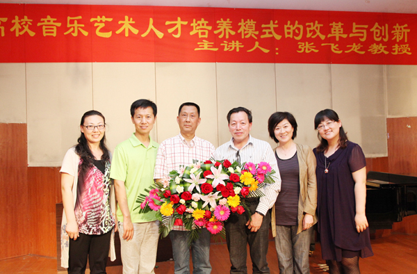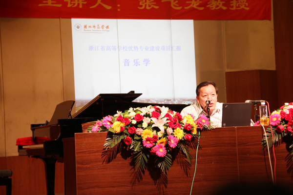 随后,张飞龙教授做了题为《高校音乐艺术人才培养模式的改革与创新》的报告,报告上,张教授从一本名为《对大学说“不”》的书籍和当前教育界的热点话题谈起,谈到当今大学的现状和发展,在面临当下大学危机感的时候,大学的办学使命就是要把“危机”转化为“机遇”,强调音乐教育改革的培养目标必须围绕“学生创造思维的培养,人文精神的培养”这一中心开展,努力培养“三型”(即全面发展型、综合型、创新型)的音乐专业人才。紧接着从音乐美学和音乐史学方面谈了音乐学学科内部的关系,阐述了音乐学和心理学、社会学等各类学科的相互关系等,认为在学科交叉与融合中才能闪烁出科研创新的火花。最后他结合湖州师范学院艺术学院的办学理念谈了自己对音乐学学科建设的意见和看法。他说要建立特色学科,以特色立校、以特色取胜,如培养构建“站稳讲台、唱响舞台”的“双台模式”,以及要求四年本科毕业生要完成“100首歌曲演唱、100首作品赏析、100首歌曲伴奏”的“三百工程”,要充分展示学生的艺术个性,贯彻因材施教,构建学生的“成才路线图“。对于湖州师范学院艺术学院迎接教育部评估中的工作体会,张飞龙教授毫无保留的向我院师生进行了传授和指导,对我院的学风、教风建设和明确我院今后的发展方向,都具有重要的指导意义。