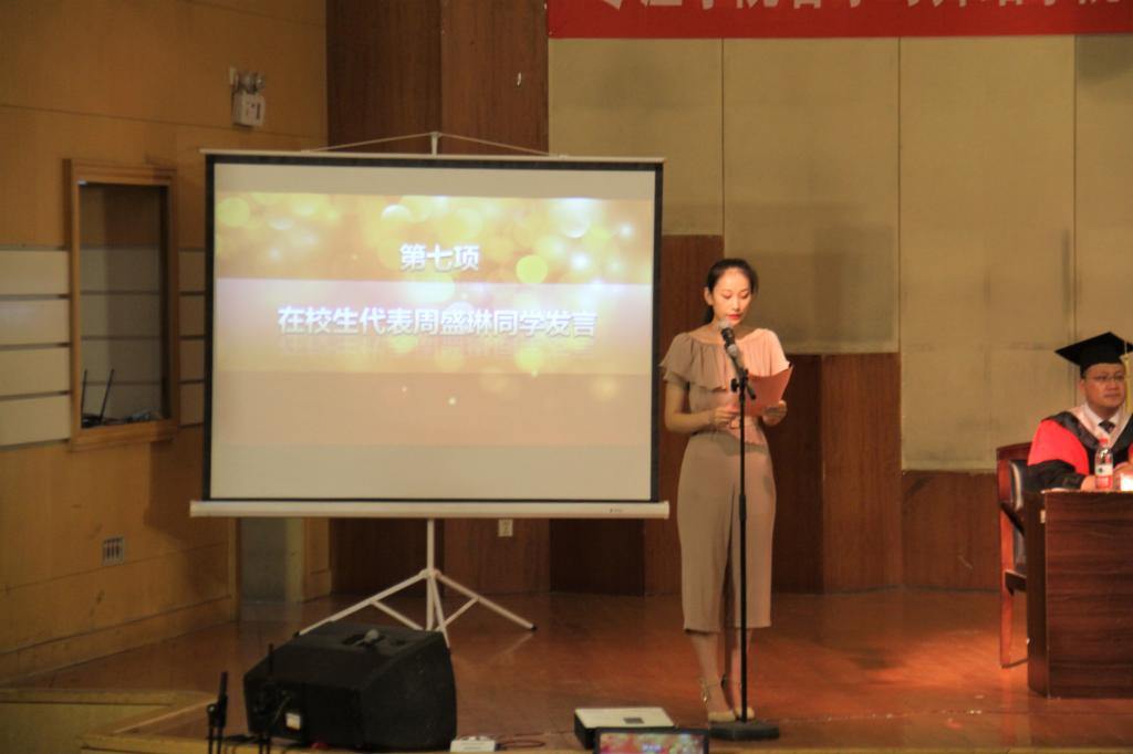 毕业生班主任张涛、杨川川老师接受了2018届毕业生向学院赠送的纪念品;教师代表张雅青老师表达了对毕业生的不舍之情和殷切嘱托,现场很多师生热泪盈眶、为之动容;周盛琳代表在校生为即将离开母校的学长学姐表达了诚挚的祝福;毕业生代表刘雅菲、寇兴朔、杜佳、杨将等同学发表了毕业致词,情真意切、感人至深。最后校级优秀毕业生、原学生会主席李泓洋带领全体毕业生隆重宣誓,不忘母校培育恩情,誓做国家栋梁之才,为老师增光,为母校添彩。