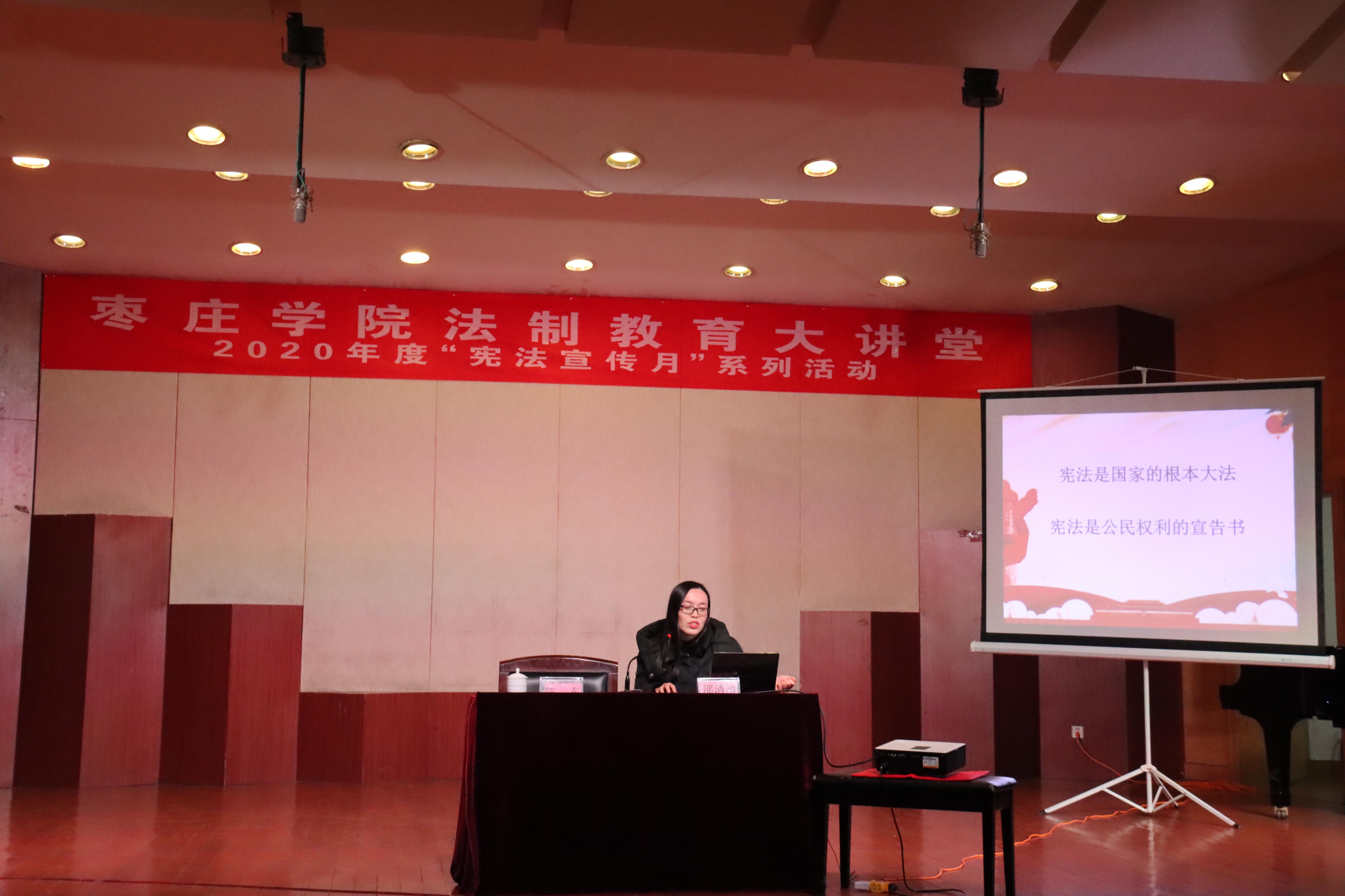 为弘扬法治精神,提高学生法律素养和法律意识,2020年12月9日晚,77779193永利官网集团于音乐厅举行“77779193永利法制教育大讲堂”讲座,邀请党委宣传部邵清清为2020级全体同学进行法律知识宣讲,本次讲座由院团学负责人陈东主持。