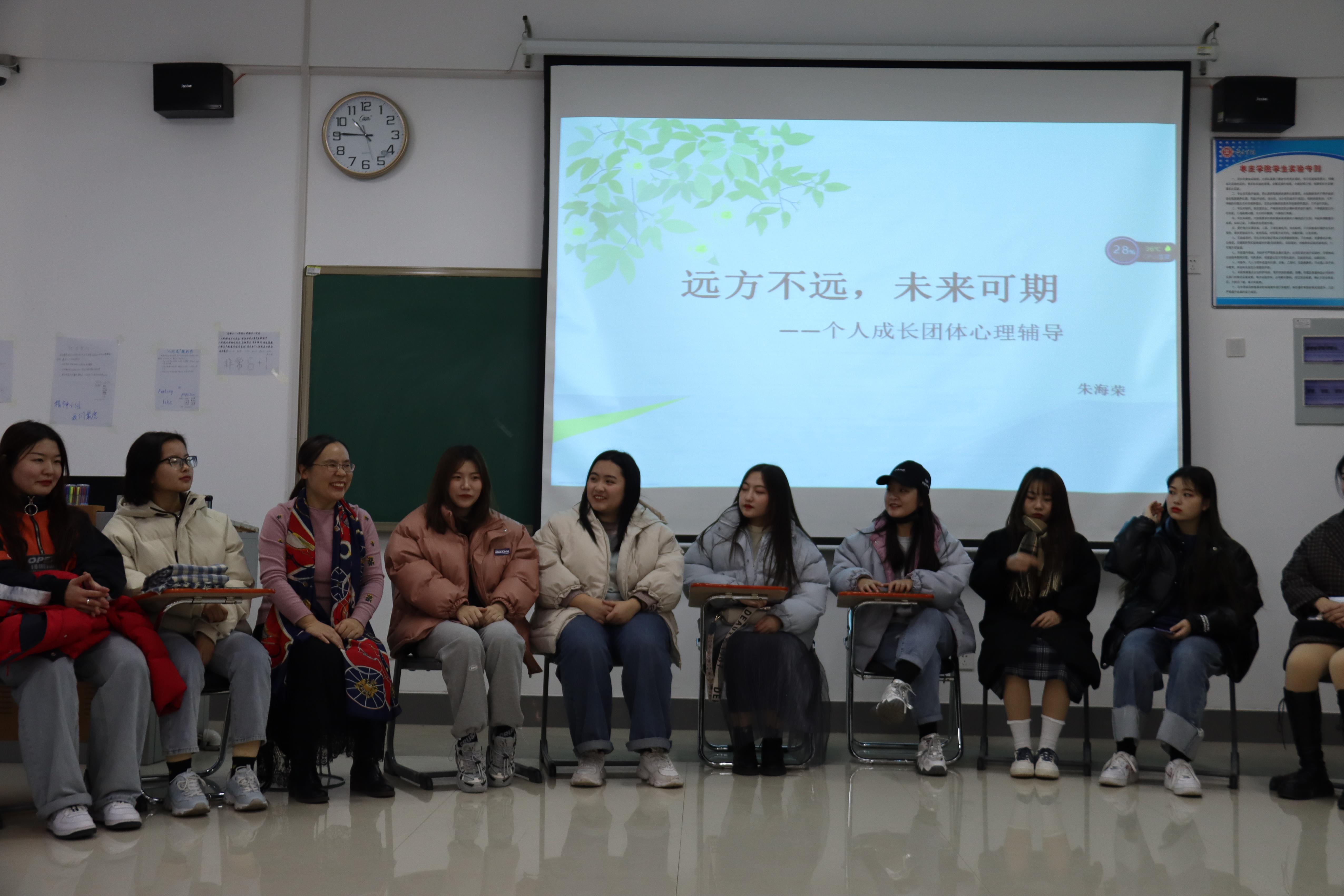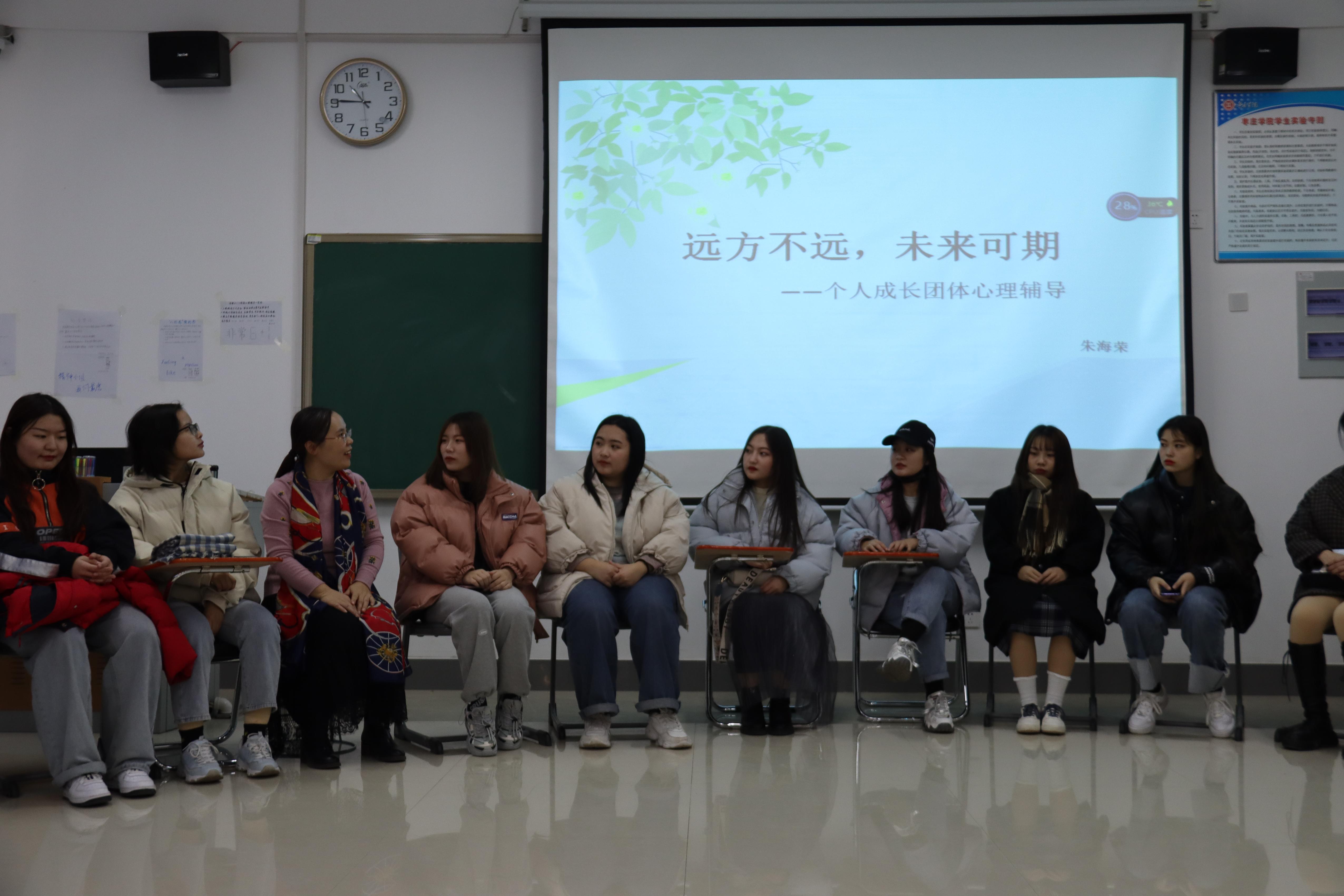 77779193永利官网集团12月23号开展了“远方不远 未来可期”个人成长团体心理辅导。本次活动由心科院朱海荣老师主持,2020级音乐学本科班全体女生参加。