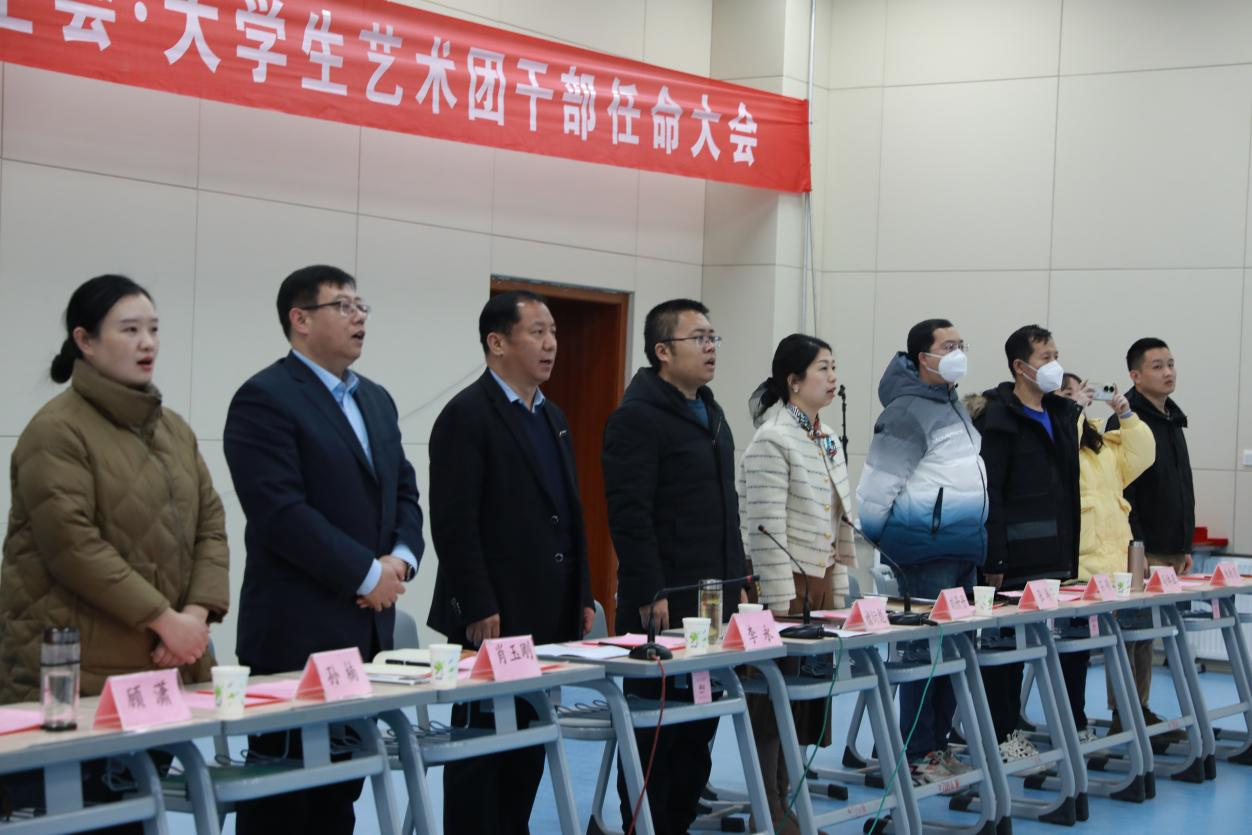 在嘹亮的国歌声中,换届任命大会拉开了序幕,团总支书记刘丹丹郑重宣布了60位学生干部的任命。领导老师为新任学生干部颁发聘书,亲切握手嘱托并合影留念。新任学生会·大学生艺术团主席兼团长朱方晓带领2023届学生干部宣誓,誓言整齐划一、铿锵有力,将任命大会推向高潮。