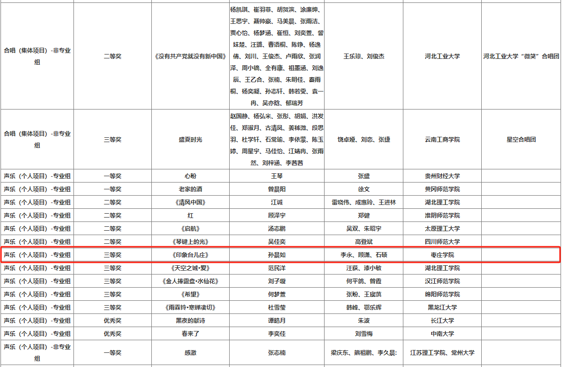 此次比赛共收到全国近2500首作品参赛,获奖作品仅100余首。我院参赛作品《印象台儿庄》由我院党委书记李永教授、顾潇、石硕全程指导,由2023级音乐学(升本)专业学生孙晨如演唱,《印象台儿庄》以台儿庄的历史文化、风土人情为创作蓝本,旋律优美动听,歌词饱含深情,生动地描绘出台儿庄古城独特的韵味和深厚的文化底蕴。经过激烈比拼,该作品突出重围,荣获声乐个人项目专业组三等奖第一名的好成绩。