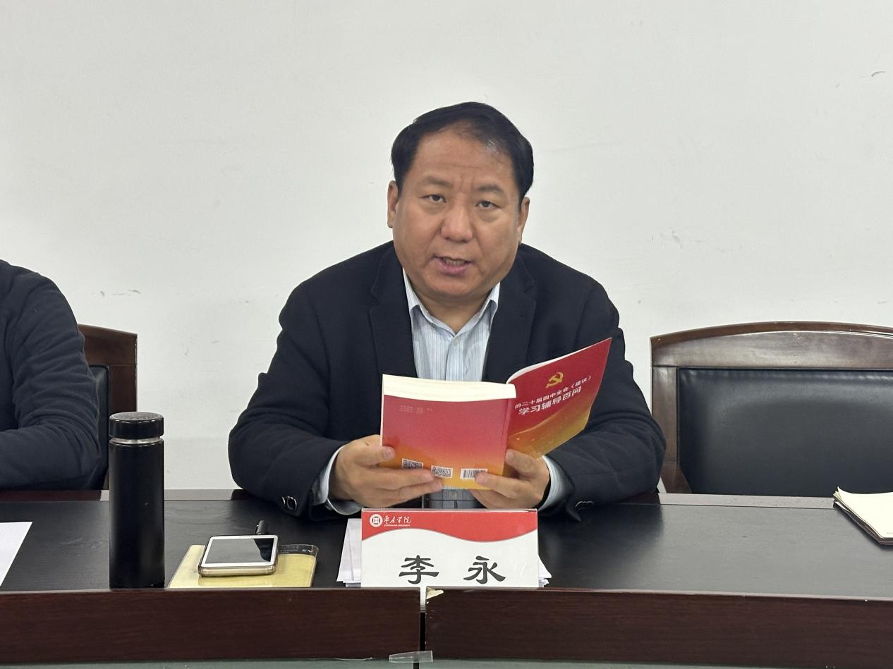 李永书记向全体教职工发出学习号召,一要持续深化理论学习,把学习党的二十届四中全会精神作为当前重要政治任务,通过集中学习、个人自学、研讨交流等形式学深悟透。二要推动成果转化落地,将全会精神转化为推动教学改革、科研创新、艺术实践的具体行动,着力打造特色鲜明的艺术教育品牌。三要强化责任担当,立足三尺讲台,深耕艺术育人领域,以高质量教育成果为文化强国建设贡献学院力量。