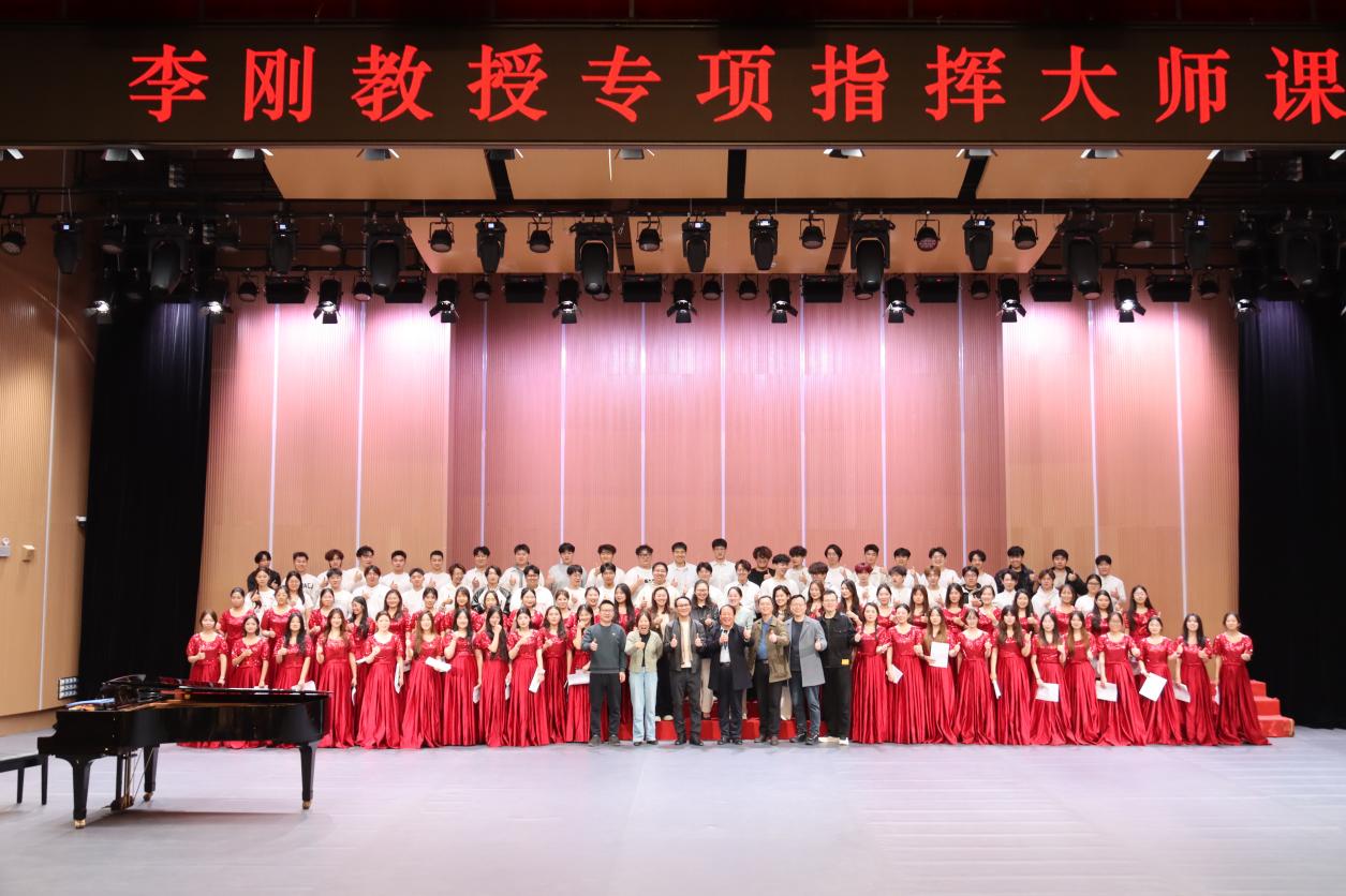 聘任仪式后,李刚带来《从胜利走向胜利——国家庆典合唱纪实美育思政课》专题讲座,李刚是我国合唱指挥领域的泰斗级专家,在数十年的教学与实践中,李刚教授深耕红色音乐思政教育,将大型国家庆典合唱的实践经验与美育育人深度融合,为我国音乐教育事业尤其是红色合唱艺术的传承与发展,倾注了大量心血,树立了标杆典范。讲座中,他以2025年“九三阅兵”天安门广场三千人合唱为核心载体,结合亲身经历与独家幕后素材,将国家重大庆典中的合唱艺术转化为鲜活的思政教材。讲座以“胜利”主题为核心展开,回望抗战峥嵘岁月,解析“九三阅兵”的时代意义,阐释美育核心内涵,深度解读抗战经典合唱曲目背后的精神内核,分享分指挥团队协作的幕后故事,生动展现了合唱艺术中蕴含的抗争精神、家国情怀与集体主义精神,让现场师生沉浸式感受艺术深度与思政温度的同频共振。讲座尾声,李刚亲执指挥棒,邀请学生共同指挥,带领全体师生齐声高唱《歌唱祖国》,并向学生指挥赠送“九三阅兵”合唱总谱,激昂的旋律点燃现场热情,让师生在亲身体验中深化艺术感悟与思政认同。现场学生纷纷表示,今后将把所学所感转化为实际行动,锤炼专业本领,厚植家国情怀,以实际行动践行新时代青年的使命与担当。