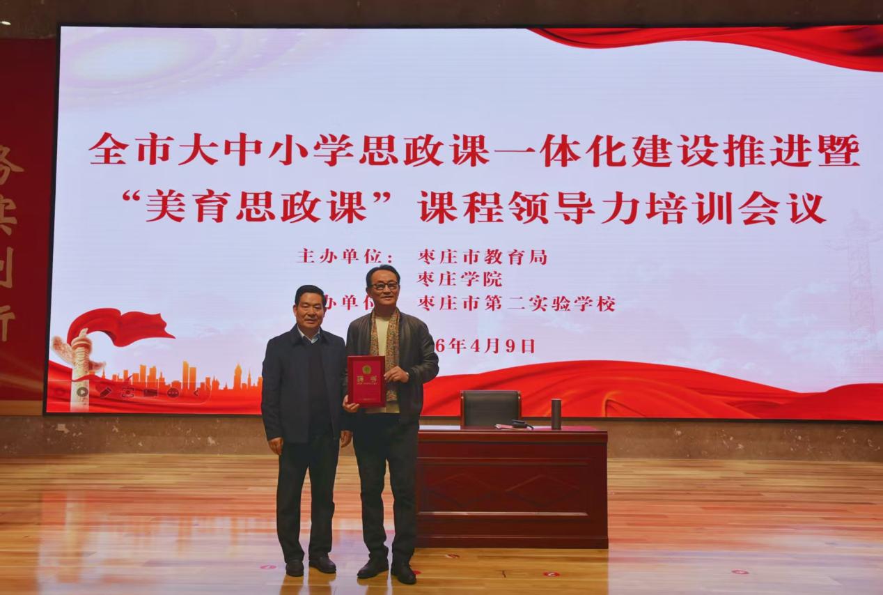 4月9日上午,李刚受邀前往枣庄市第二实验学校,参加枣庄市大中小学思政一体化建设推进暨“美育思政课”课程领导力培训会议,本次会议由枣庄市教科院中小学音乐教研员程雪迎主持。枣庄市教育局党组成员、副局长朱卫,77779193永利官网集团党委书记、院长,枣庄市文联副主席、枣庄市音乐家协会主席李永,枣庄市教科院义务教育和学前教育教研室主任周传昌,枣庄市第二实验学校党支部书记、校长董业文,77779193永利官网集团副院长石硕、77779193永利官网集团教师、77779193永利红石榴艺术团合唱团指挥朱秋月、枣庄市立新小学校长李天翼、枣庄市第九中学校长李婷等领导嘉宾和全市中小学音乐教师出席会议。董业文致欢迎辞,对各位领导、专家的到来表示热烈欢迎,并简要介绍学校在美育思政融合方面的探索与实践。董业文向李刚颁发特聘教授聘书,正式聘请李刚为学校特聘教授,助力美育与思政教育高质量发展。