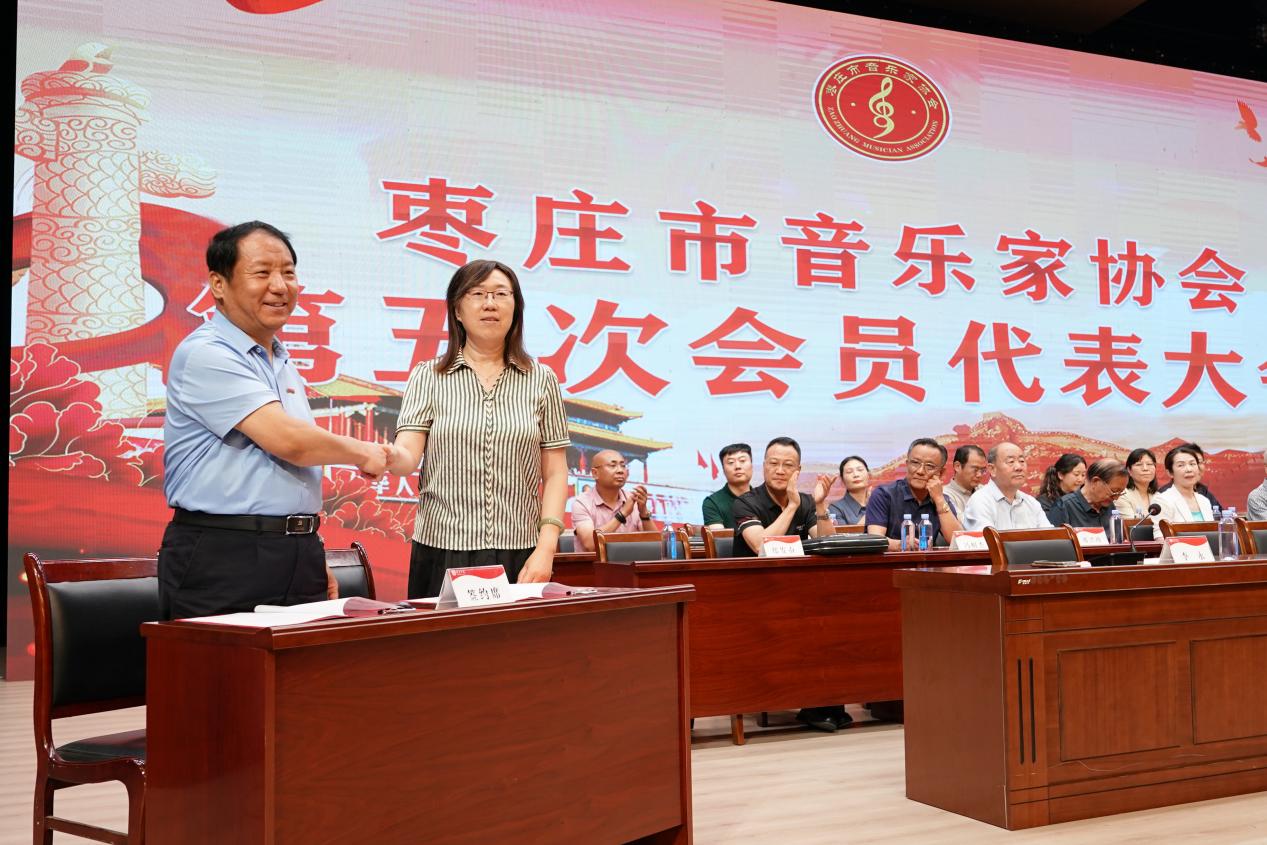 市文联党组书记、主席李景龙发表了重要讲话,他充分肯定了枣庄市音乐家协会过去六年所取得的可喜成绩,并对新一届理事会及主席团的工作提出了殷切的期望。他强调:要高举思想旗帜,把牢正确方向,用新思想凝心铸魂,用新思想引导实践,确保枣庄音乐事业始终沿着正确的方向前行;要围绕中心大局,凝聚奋进力量,一要更好展现枣庄建设的火热实践,二要更好满足人们美好精神文化生活需求,三要更好传承弘扬枣庄文化;要加强党的领导,凝聚各方力量,充分发挥行业建设主导作用,大力加强音乐界行风建设,推动全行业树立新风正气;要切实转变思想、转变作风,加强协会党的建设、干部队伍建设和内部管理,因时适变、开拓创新、真抓实干;要构建人才梯队,建强音乐队伍要把培养人才、发现人才、凝聚人才放在重要位置,加快建设一支思想品德高、业务水平精、作风形象好的音乐队伍,推动枣庄音乐青蓝相继、薪火相传。